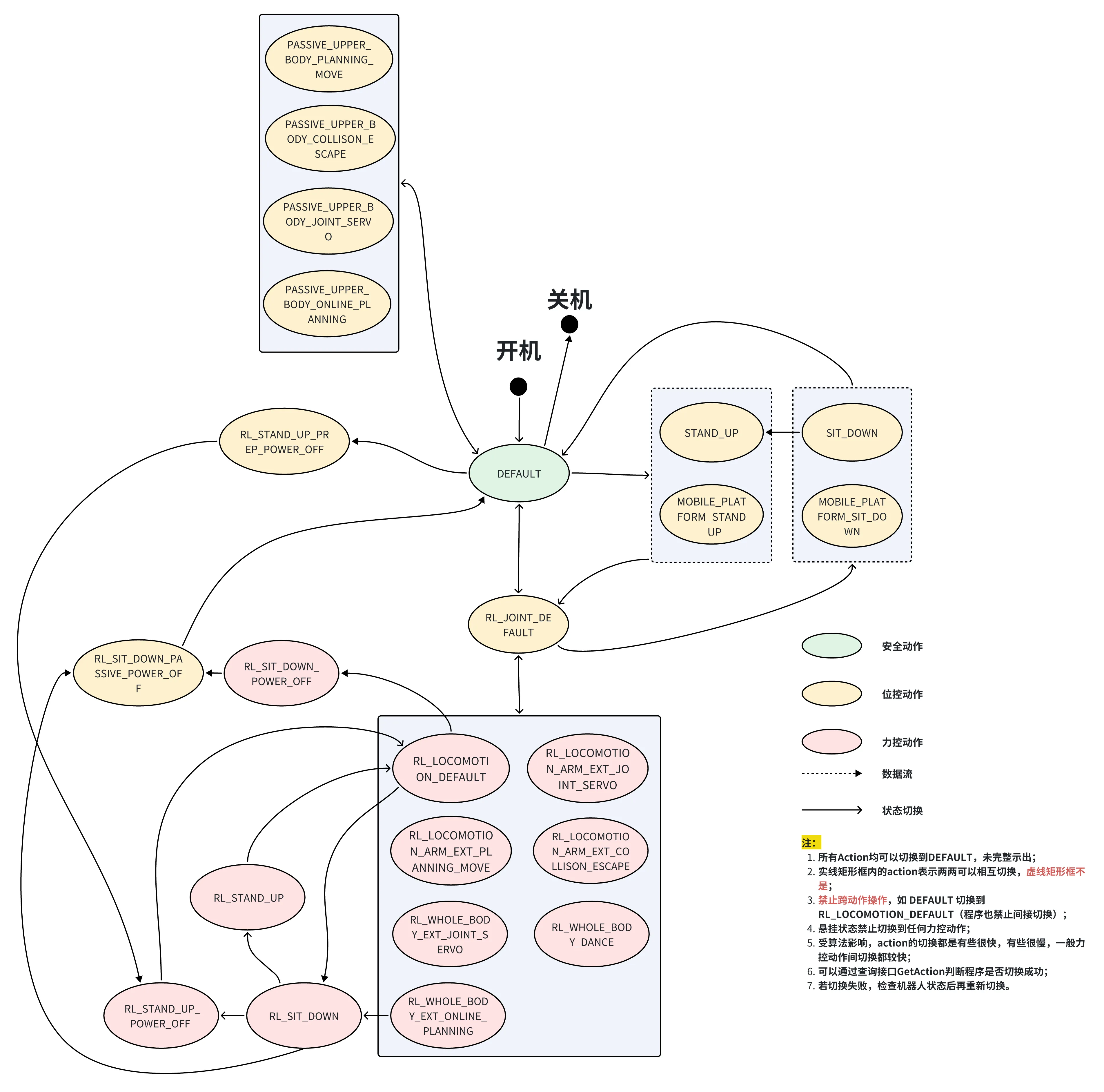 智元运控程序内部设计了状态机,在不同状态下会切换不同的模型,同时开放不同的上肢控制接口等。状态机如下图所示: