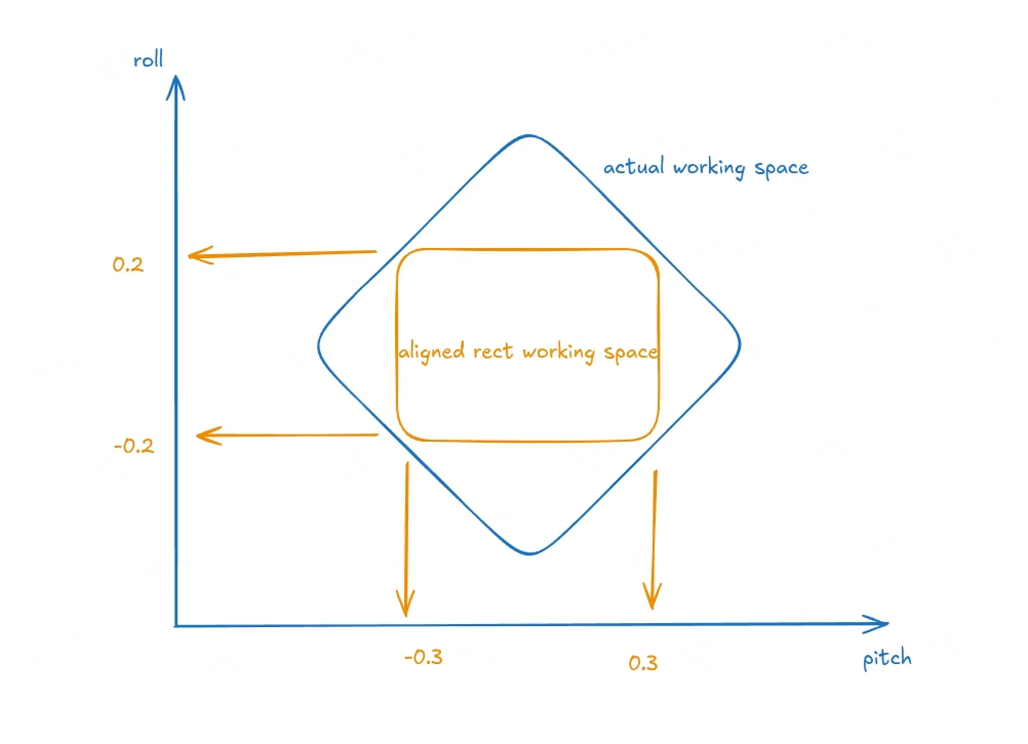 注:双臂的6 7关节通过并联机构实现腕部控制,受并联机构的几何约束的影响,推杆的并联自由度映射到 pitch/roll 串联自由度后,得到的活动空间并不是矩形区域,而是类似一个菱形区域,示意图如下图蓝色区域所示:
