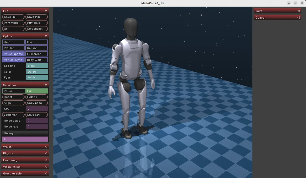 Section titled “8.1 仿真说明”我们为 A2 机器人提供了基于 mujoco 的仿真系统,旨在提供一个可以对 A2 机器人的运控和动作播放接口进行基本调用的试验场,用作实机运行前的一个基本验证,减低损坏机器人本体风险同时方便调试二次开发程序逻辑等。