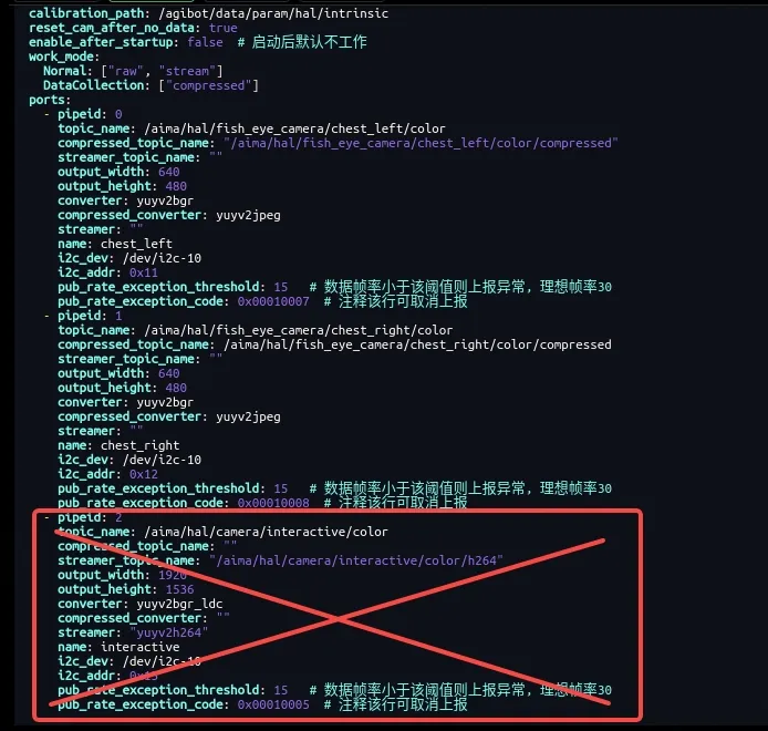 - 修改orin目录下的/agibot/software/v0/config/tzcamera/tzcamera_config.yaml,删除需要单独访问的相机对应的配置条目(此处为中间交互摄像头)。